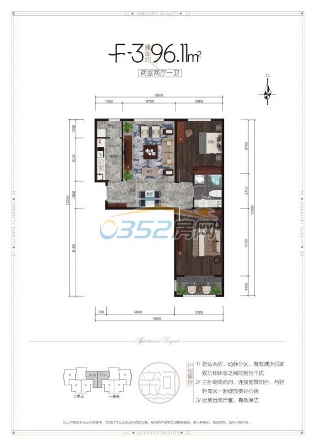 F3戶型:建面約96.11㎡ 兩室兩廳一衛(wèi)