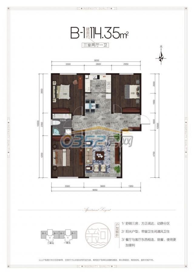 B1戶型:建面約114.35㎡ 三室兩廳一衛(wèi)