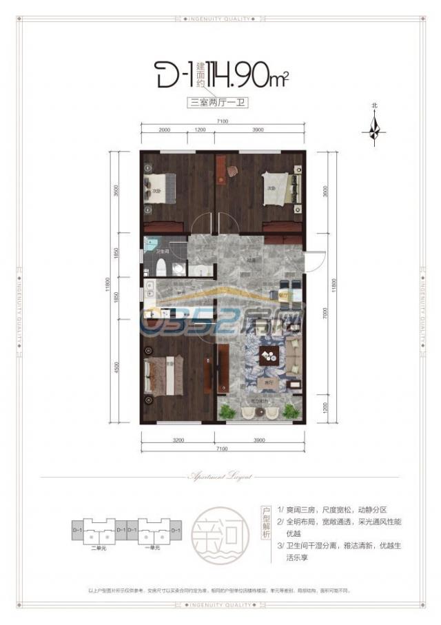 D1戶型:建面約114.9㎡ 三室兩廳一衛(wèi)
