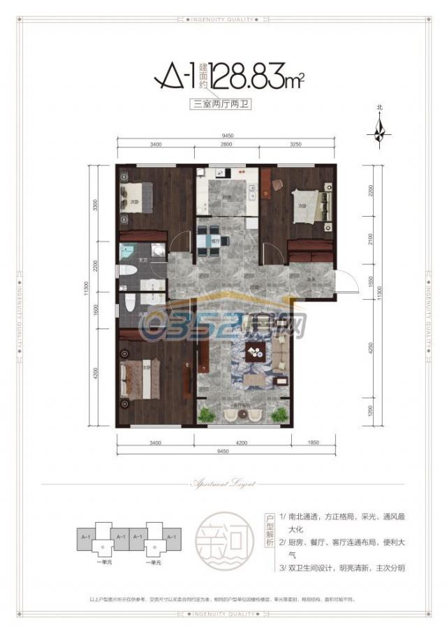A1戶型:建面約128.83㎡ 三室兩廳兩衛(wèi)