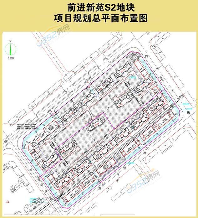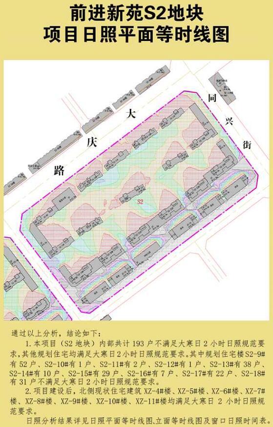 以下是前進新苑S2地塊建設項目總平面布置圖、日照平面等時線圖: