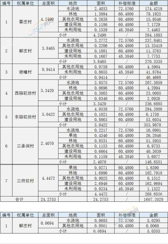征地詳細情況(單位:公頃、萬元、萬元/公頃)