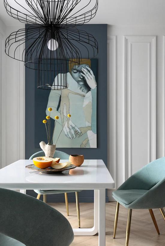 一盞引人注目的線框吊燈戲劇性地降落在用餐區(qū)