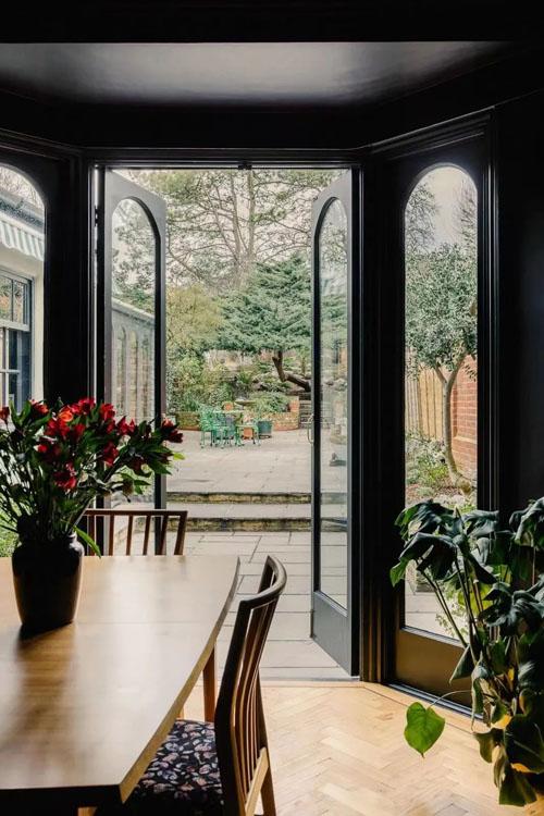 打破純白的寡淡,用餐空間的色彩搭配溫情且充滿情感,這里的深色調讓空間變得非常有厚度,而淺木色則多了溫柔放松的氛圍。打開高大的黑色玻璃門,則能感受綠意盎然的希望。