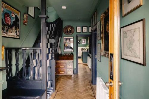 藍色與綠色都象征著許多積極情緒,給人以舒適、可靠的感覺,用在樓梯間作為背景,也能煥活寧靜空間。加上背景中掛著各種畫作,踩著樓梯一路向上,仿佛就能帶回往昔的歲月。