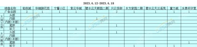 2023年6月12日至2023年6月18日,共有10個項目在統計的2類報紙上投放了12則廣告,平均每個項目發表廣告1.2次。