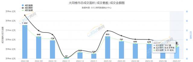 2022年7月大同樓市總成交套數785套左右,總成交面積約10.3萬平方米,總成交額約8.3個億,同比來看,2023年7月大同樓市成交數據與去年同期相比呈下降趨勢。