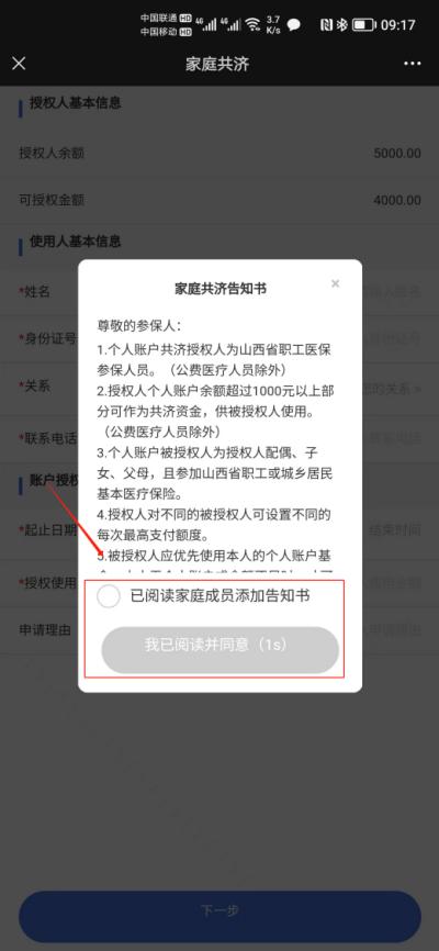 請(qǐng)仔細(xì)閱讀《家庭共濟(jì)告知書》的詳細(xì)內(nèi)容,然后勾選”已閱讀家庭成員添加告知書”,并點(diǎn)擊”我已閱讀并同意”,進(jìn)入下一步。