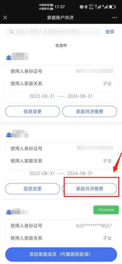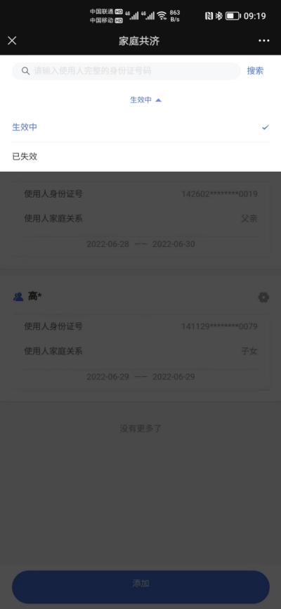 添加家庭成員后,可通過家庭共濟(jì)功能首頁(yè)查看所有已添加的家庭成員(根據(jù)生效時(shí)間區(qū)分為有效和無效)。