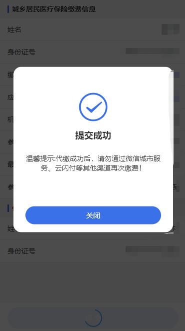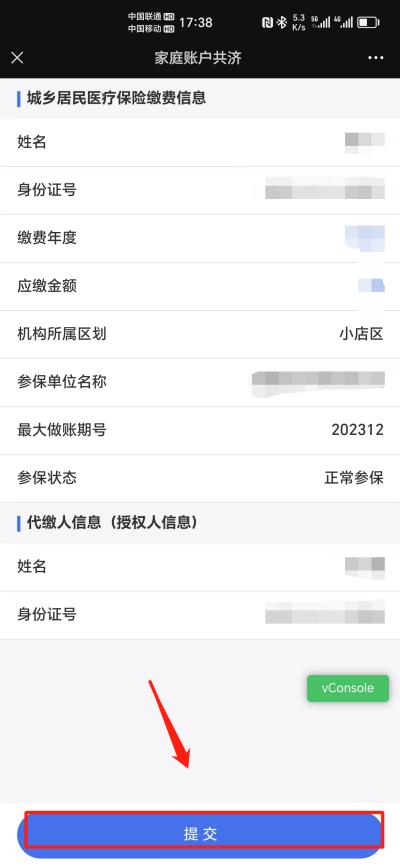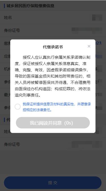 核對(duì)居民信息,繳費(fèi)年度以及應(yīng)繳金額等重要信息,確認(rèn)無誤后,點(diǎn)擊“提交”按鈕。