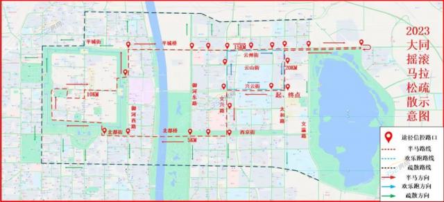 1、半程馬拉松比賽管制路段:文瀛湖辦公樓廣場(起點)→興云街→文興路→西京街→北都橋→北都街御河西路口→北都街→永泰東門(進入古城)→永泰內街→清遠內街→清遠街→華嚴街口→華嚴廣場→鼓樓西街→鼓樓→四牌樓→和陽街→太平樓→和陽內街→和陽北門(出古城)→御河西路→國賓崗→平城橋→云州街→云州街柳鶯路口(折返)→云州街→太和路→文瀛湖辦公樓廣場(終點)。