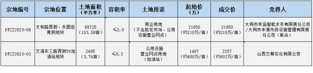 摘要:大同市御東新區迎來兩宗地塊的掛牌成交,一宗商業用地,一宗加油站用地,具體成交詳情如下。