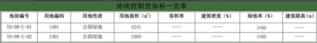 規(guī)劃確定C-01地塊用地性質(zhì)為公園綠地(1401),用地面積4241平方米;C-02地塊用地性質(zhì)為公園綠地(1401),用地面積3385平方米;依據(jù)規(guī)劃用地性質(zhì)賦予地塊相應(yīng)控制性指標(biāo)。