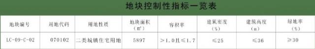 規劃確定LC-09-C-02地塊用地性質為二類城鎮住宅用地(070102),用地面積為5897平方米,依據規劃用地性質賦予地塊相應控制性指標。