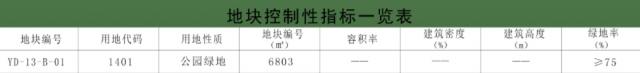 規劃確定B-01地塊用地性質為公園綠地(1401),用地面積6803平方米,依據規劃用地性質賦予地塊相應控制性指標。
