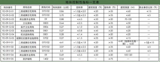 規劃確定YD-09-D-01、YD-09-D-02、YD-09-F-01、YD-09-F-02、YD-09-F-03地塊用地性質均為二類城鎮住宅用地,YD-09-G-01為文化用地,YD-09-G-02為醫療衛生用地,YD-09-G-03、YD-09-G-04為機關團體用地,YD-09-G-05為城鎮社區服務設施用地,YD-09-D-03、YD-09-F-04為商業服務業用地,YD-09-F-05為防護綠地。地塊用地面積詳見下表,依據規劃用地性質賦予地塊相應控制性指標。