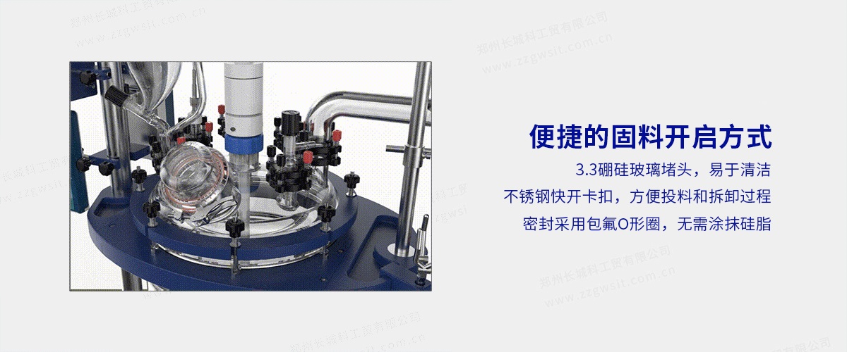 4、便捷的固料開啟方式:高硼硅玻璃堵頭,易于清潔,耐腐蝕性更好,不銹鋼快開卡扣,使投料和拆卸過程方便,密封采用包氟O型圈,無需涂抹硅脂;