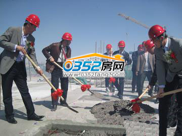 公司管理層與山西四建負責人在2號樓頂共同揮鍬完成封頂合龍