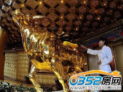 在龍希國際大酒店60層,工作人員正在為鎮樓之寶——號稱“價值3億元人民幣”的金牛做保潔。據華西村老書記吳仁寶介紹,這頭一噸重的金牛從入庫到現在已增值三成。龍希國際大酒店大樓高328米,共74層,與北京國貿三期高度一樣,已成為華西村新的地標性建筑,將于10月8日華西村建村50周年當天對外營業。
