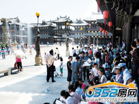 與上華嚴寺山門相對的中心廣場上,鋪裝造型以佛教文化為主題,取材于大同博物館館藏文物的高9.9米的雕塑立于噴泉池中。天宮樓閣是華嚴廣場的主體景觀,主樓中央部分為凌空而建的三開間觀景閣,猶如云端瓊樓,整個樓閣建造工藝精巧、外形宏偉壯觀,包括象眼、角獸等細節都如實地反映了遼宋時期的建筑特色。與華麗的天宮樓閣不同,位于廣場北側的二層仿古商業建筑以功能使用為主,突出了宋代民居及商業建筑的造型特點,在造型上采用了主、從、輔三種屋頂作為立面分割,用表面包木的方法做出木構建筑的色彩和質感,同時用木質懸魚、搏風板等細部構件來體現木建筑的精華,造型簡潔而不失古樸。面積為1.1萬平方米的地下停車場已全面完工,智能化管理系統安裝進入最后調試階段。