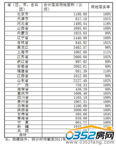 截至2011年10月14日,全國31個省(區(qū)、市,含兵團(tuán),西藏除外)今年落實中央下達(dá)保障性安居工程建設(shè)任務(wù)用地42614公頃,用地落實率超過100%(詳見附表),已超額完成今年中央下達(dá)的保障性安居工程用地落實任務(wù)。
