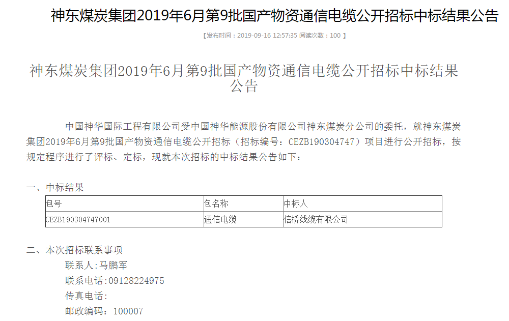 點擊數(shù):69062019-11-21 00:00:00 來源: 神東煤炭集團2019年6月第9批國產(chǎn)物資通信電纜公開招標中標結(jié)果公告