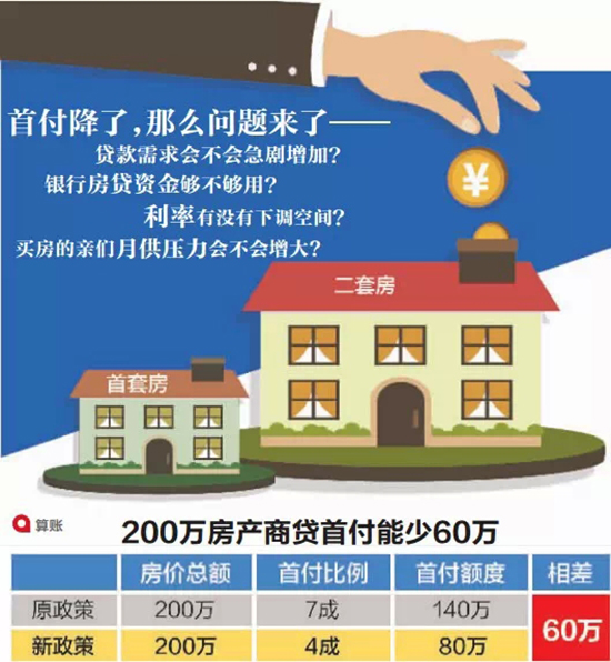 北京市一套市值300萬元的房屋為例,按照現有的二套房首付比例七成計算,首付款210萬元;若首付為四成,則減少90萬元,至120萬元。