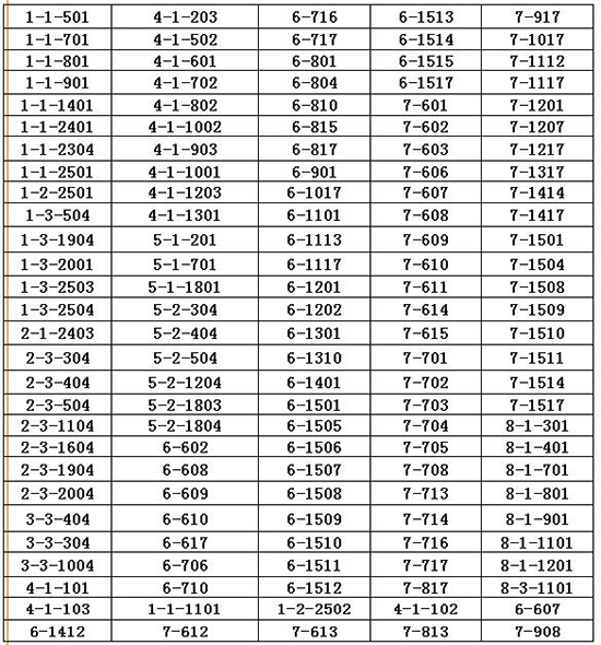 東7-1-1102 東7-2-501 東7-2-601 東7-2-701 東7-2-901 東7-2-1001 東7-2-1301東7-2-1401 東7-2-1501東7-2-1002 東7-2-1102 東7-2-1202 東7-2-1502 東7-2-1702西1-1-601 西-1-801 西1-1-901 西1-1-1101 西1-1-1201 西1-1-1301 西1-1-1501西1-1-1601 西1-1-1701西1-1-602 西1-1-702 西1-1-802 西1-1-1502 西1-1702