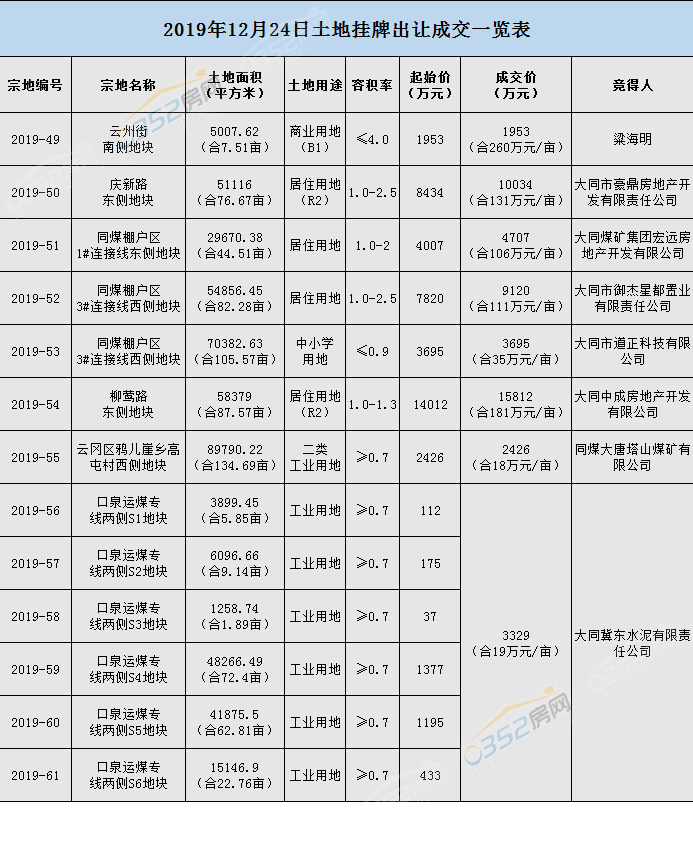 1、2019年12月24日,大同市規劃與自然資源局公開出讓云州街南側等13宗地塊,均被房企成功競得。以下是13宗地塊成交結果一覽,具體了解一下吧!