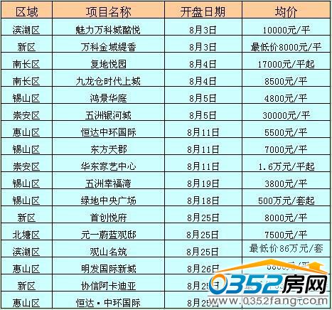 據(jù)搜房網(wǎng)數(shù)據(jù)監(jiān)控中心不完全統(tǒng)計數(shù)據(jù)顯示,截止8月31日,無錫樓市8月份共有17個項目如期開盤,占預計開盤量的51%,其中開盤高峰期集中在中下旬。