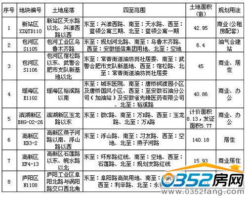 10月24日,合肥市土地市場(chǎng)網(wǎng)發(fā)出招拍掛公告,一次性推出分別位于新站、包河、瑤海、濱湖、高新、廬陽(yáng)的8宗地塊。其中2宗純住宅用地,總面積約249畝,此前流拍的高新區(qū)KD3-2地塊又再次入市;2宗商住用地,總面積60.93畝;3宗商業(yè)用地,1宗油氣合建站用地。