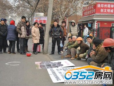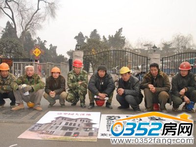 1月13日上午,陰天,霧氣氤氳的鄭州街頭,寒風刺骨,幾名衣著單薄的農民工,頭戴安全帽,嘴唇凍的發紫,一字排開蹲在地上,面前放著一別墅的“實物效果圖”,擺攤叫賣,”別墅”旁邊的木板上面寫著“賣別墅,別墅面積:300-400平方米,聯系人:信陽100多農民工”字樣,并表明歡迎各路貪官前來購買。