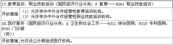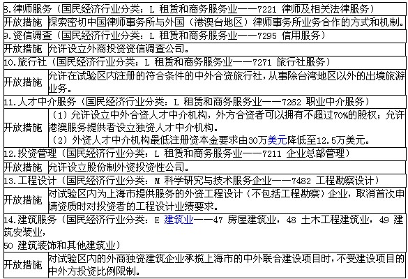 2.擴大服務業開放。選擇金融服務、航運服務、商貿服務、專業服務、文化服務以及社會服務領域擴大開放(具體開放清單見附件),暫停或取消投資者資質要求、股比限制、經營范圍限制等準入限制措施(銀行業機構、信息通信服務除外),營造有利于各類投資者平等準入的市場環境。