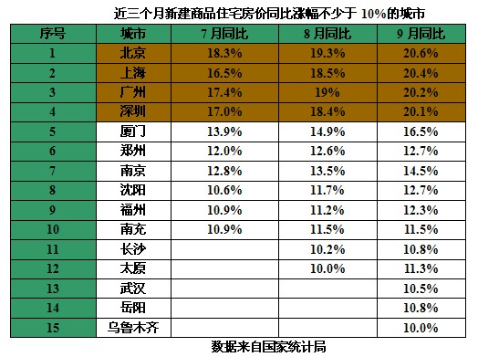 數據顯示,9月份房價同比漲幅超過10%的城市已經達到14個,除了一線城市,還有廈門、鄭州、南京、沈陽、福州等10城市。經梳理發現,自7月份以來,已經連續三個月有至少10個城市房價同比超10%。對此,中原地產市場研究部總監張大偉分析:“一、二線城市‘日光盤’頻出,而且各地用精裝修拆分等額外的購房支出也在增加。實際價格上漲幅度超過指數體現的漲幅。目前這些城市房價即使不漲了,年底的指數漲幅也將超過10%。”