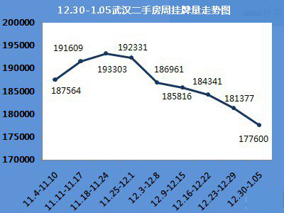 搜房網(wǎng)二手房數(shù)據(jù)監(jiān)控中心數(shù)據(jù)顯示,2013年12月30日-2014年1月5日,本周武漢二手房的掛牌總量為177600套,比上周減少了3777套,環(huán)比下跌2.08%。
