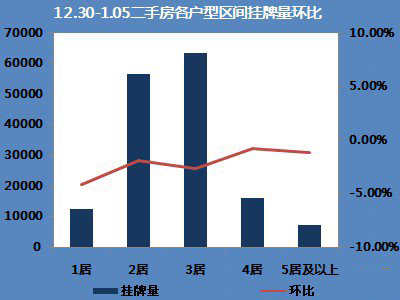 搜房網(wǎng)二手房數(shù)據(jù)監(jiān)控中心數(shù)據(jù)顯示,2013年12月30日-2014年1月5日,武漢二手各戶型的掛牌量均有所下跌。其中跌幅最大的是一居室,本周掛牌總量為12310套,環(huán)比下跌4.15%;其次為三居室,本周掛牌量為63252套套,環(huán)比下跌了2.63%;二居室、四居室、五居及以上的掛牌量分別環(huán)比下跌了1.96%、0.77%和1.21%。