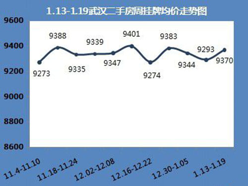 武漢二手房數據監控中心數據顯示,2014年1月13日-2014年1月19日,武漢二手房住宅掛牌均價為9370元/平方米,較上周上漲77元/平米,環比上漲0.83%,比去年同期上漲了10.50%。