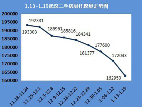 武漢二手房數據監控中心數據顯示,2014年1月13日-2014年1月19日,本周武漢二手房住宅的掛牌總量為162950套,環比下跌5.29%。