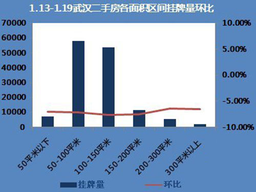 武漢二手房數據監控中心數據顯示,2014年1月13日-2014年1月19日,武漢二手房住宅各面積區間的掛牌量均有所下跌。其中跌幅最大的是100-150平米的房源,環比下跌7.59%;其次為150-200平米的房源,環比下跌7.17%。