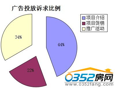 廣告中,訴求點是關鍵內(nèi)容,在此次統(tǒng)計中,有相當一部分的樓盤投放信息是相關的項目介紹,其次是開發(fā)公司推廣活動,而其中項目銷售占少部分,這也和項目具體的銷售節(jié)點有關。