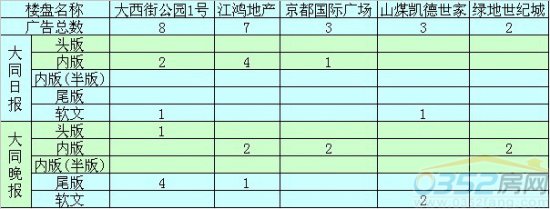注:0352房網(wǎng)研究在廣告監(jiān)測中對報(bào)紙平面媒體版面統(tǒng)計(jì)遵循如下原則:全版、軟文、半版的信息組合、二手房信息不在統(tǒng)計(jì)范圍內(nèi),網(wǎng)絡(luò)媒體以投放次數(shù)為單位。