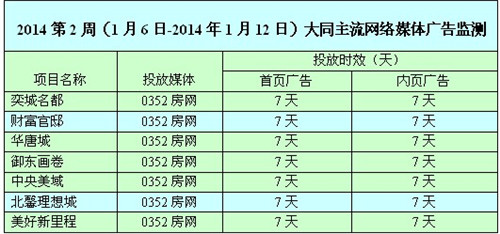 2014第2周(1.6—1.12)大同樓市主流媒體監(jiān)測(cè)