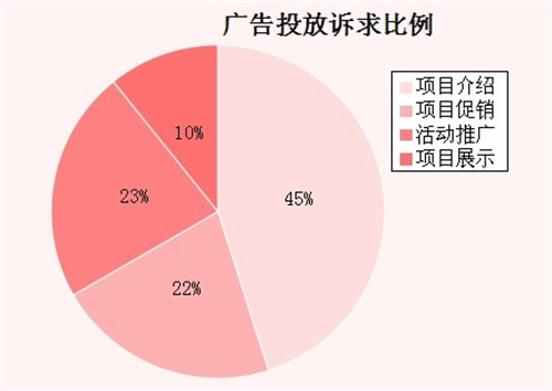 廣告中,訴求點(diǎn)是關(guān)鍵內(nèi)容,在此次統(tǒng)計(jì)中,整體上看,廣告訴求集中在項(xiàng)目介紹上,達(dá)到46條,項(xiàng)目促銷和活動(dòng)推廣分別為22條,23條,項(xiàng)目展示因?yàn)橐辉碌捉咏^(guò)年,各大樓盤開(kāi)始做拜年廣告。