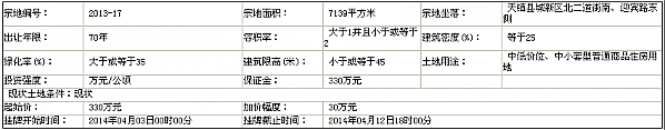 2013-17 號(hào)地塊:2014年04月03日00時(shí)00分 至 2014年04月12日18時(shí)00分 ;