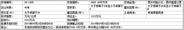 六、 本次國(guó)有土地使用權(quán)掛牌活動(dòng) 在 太原市國(guó)土資源交易事務(wù)中心(太原市金剛堰路2號(hào)國(guó)土大樓一層) 進(jìn)行。各地塊掛牌時(shí)間分別為:SG-1405 號(hào)地塊:2014年04月10日08時(shí)00分 至 2014年04月24日15時(shí)00分 ;