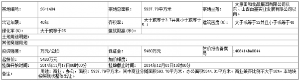 四、本次掛牌出讓的詳細資料和具體要求,見掛牌出讓文件。申請人可于2014年11月17日至2014年11月27日到太原市國土資源交易事務中心(金剛堰路2號國土大樓一層)獲取掛牌出讓文件。
