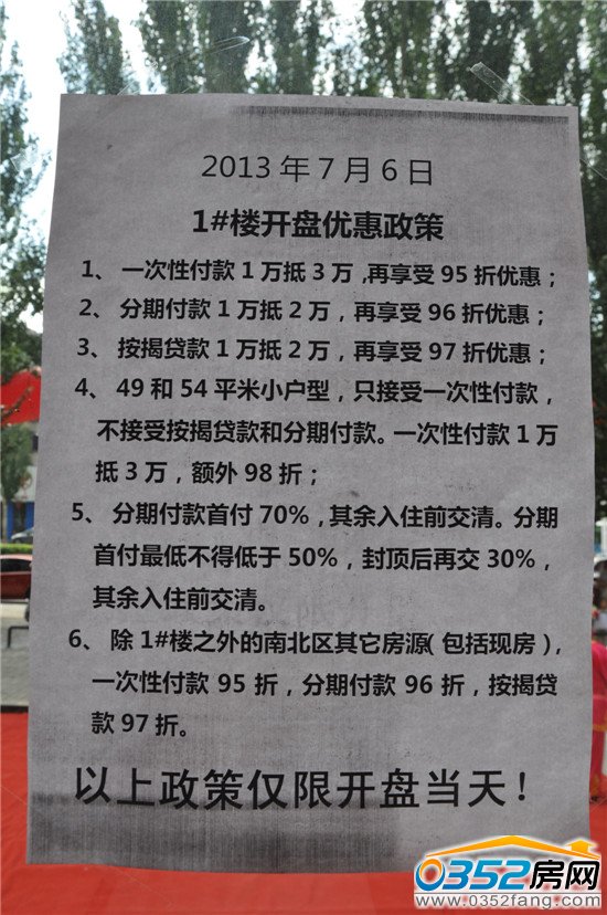 據(jù)悉,開盤當(dāng)天優(yōu)惠政策吸引了不少業(yè)主,1#樓一次性付款1萬抵3萬,在這基礎(chǔ)上再享95折優(yōu)惠,選擇分期付款1萬抵2萬,再享96折優(yōu)惠,按揭貸款1萬抵2萬,再享97折優(yōu)惠。