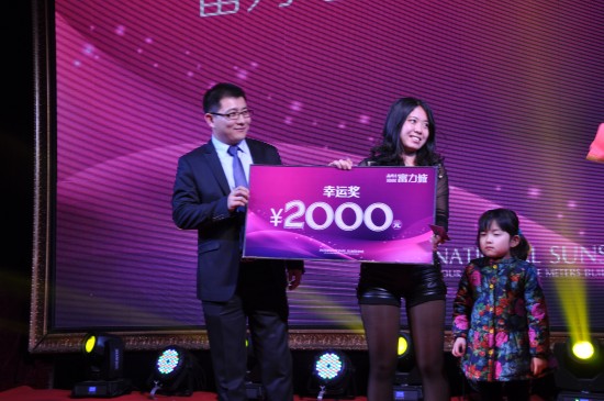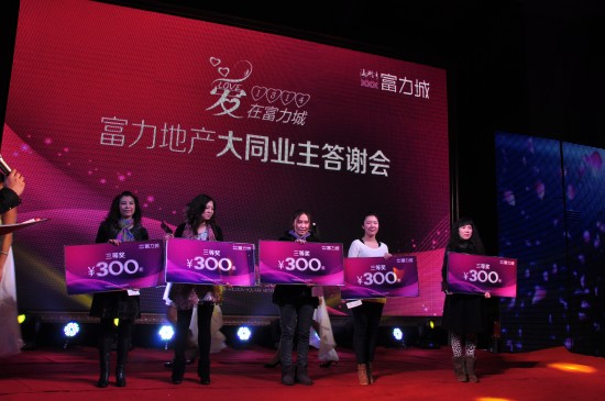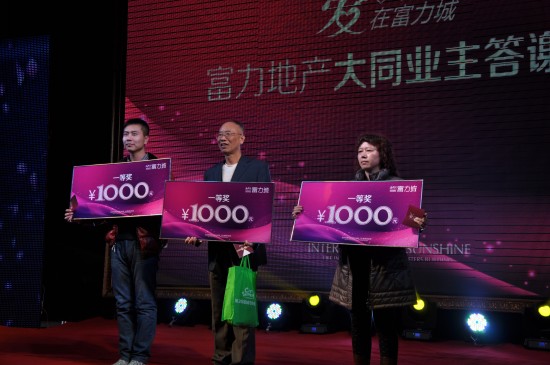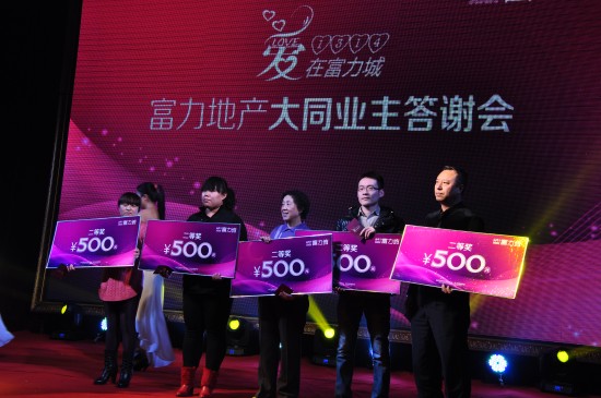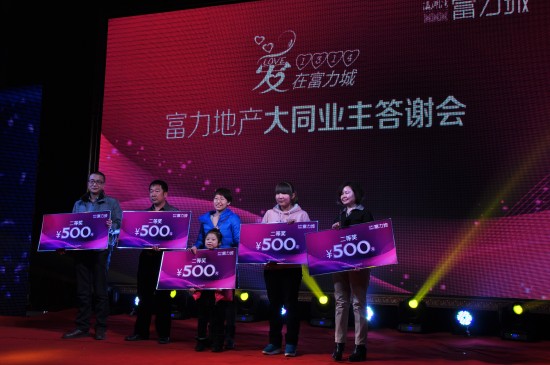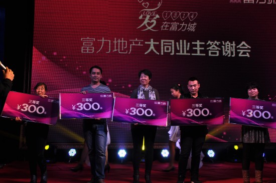 在答謝會現場,由業主抽取15個三等獎,每人300元現金;10個二等獎,每人500元現金;3個一等獎,每人1000元現金;最后,由富力地產王總抽取唯一一個特等獎,特等獎為2000元現金。