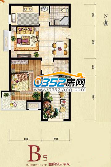 紅木林戶型圖B51室2廳1衛1廚67.00㎡#p#副標題#e#