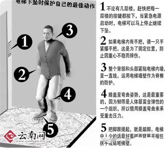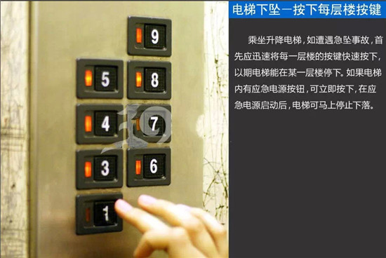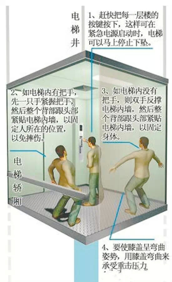 所以: 第一點是當緊急電源啟動時,電梯可以馬上停止繼續下墜。 第二點是為了要固定你人所在的位子,以致于你不會因為重心不穩而摔傷。 第三點是為了要運用電梯墻壁作為脊椎的防護。 第四點是最重要的是因為韌帶是唯一人體富含彈性的一個組織,所以借用膝蓋彎曲來承受重擊壓力,比骨頭來承受壓力來的大。 一些基本的常識可能就可以在危難來臨時挽救一個人的性命。